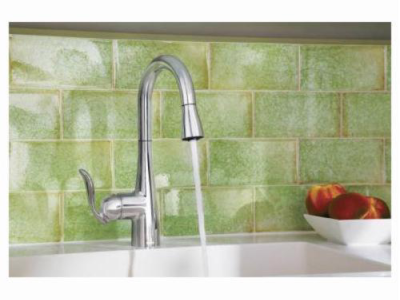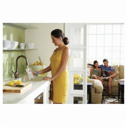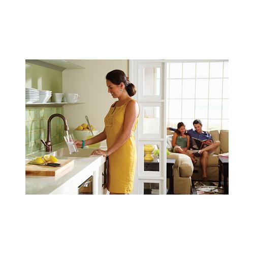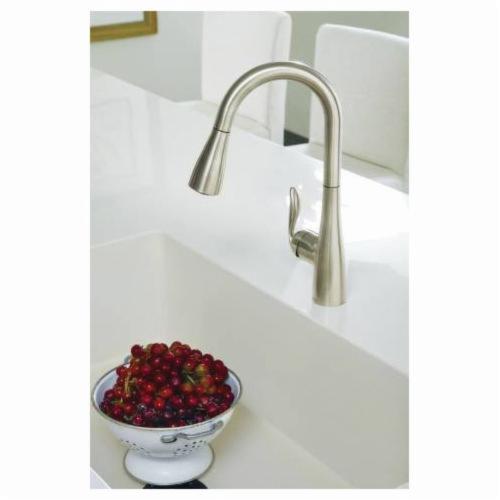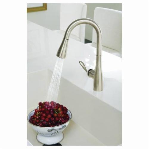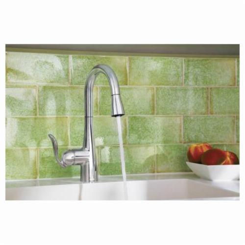 Moen®, 5995, Bar Faucet, Pull-Down, Arbor® Collection, 1.5 gpm Flow Rate, High-Arc Spout, 6.56 in Spout Reach, 13-3/4 in Spout Height, 68 in L Hose, Lever Handle, 1 Handles, 1/3 Faucet Holes, 1-1/2 in Faucet Hole, 3/8 in Connection, Compression Connection, Spray Pattern: Aerated Stream, 2 Spray Functions, 2-1/2 in Maximum Deck Thickness, Deck Mounting, 1255 Duralast® Ceramic Disc, 10.25 in W x 6.56 in D x 14.38 in H Dimensions, Metal, Chrome, Domestic