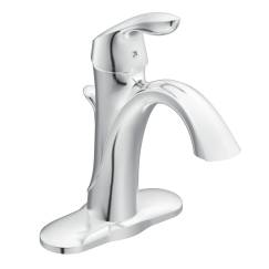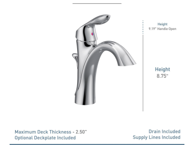 Moen® Bathroom Faucet, Eva®, 1.5 gpm, Fixed Spout, 5-1/16 in Spout Reach, 4-7/8 in Spout Height, Lever, 1 Handle, Pop-Up Drain, 1 Faucet Hole, 3/8 in, Compression, Function: Traditional, 2-1/2 in Maximum Deck Thickness, Deck Mount, 1255® Duralast® Ceramic Disc Valve/Cartridge, 2.5 in W x 6.31 in D x 8.75 in H, Metal, Polished Chrome, Domestic