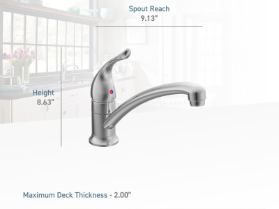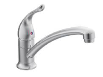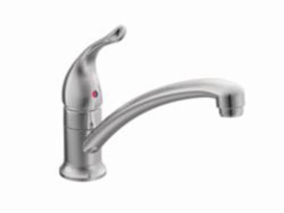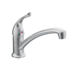 The Moen Chateau Kitchen Faucet combines reliable performance with simple, understated style. Featuring a pivoting low arc neck, lever handle, and aerated stream of up to 1.5 gallons per minute, this faucet makes every day cleaning tasks easy. This faucet is available in two finishes: a highly reflective chrome finish and a brushed chrome finish. It features a 1255 Duralast cartridge to ensure lasting performance and has a standard design that mounts on the sink or countertop.