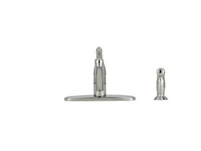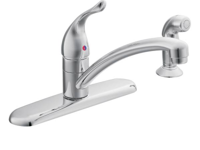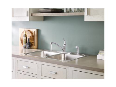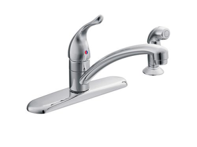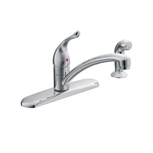 With its streamlined, no-frills style and low-arc design, the Moen Chateau Kitchen Faucet with Side Spray delivers dependable performance with understated appeal. This faucet has a single lever handle for fast water adjustments and offers an aerated stream for everyday kitchen tasks. A convenient matching side spray gives you more flexibility for cleaning and prepping in and out of the sink. For quick, no-stress installation, the Chateau faucet features the Duralock Quick Connect system and mounts on most four hole sinks or countertops configurations. Available in three attractive finishes, this faucet has a Duralast 1255 cartridge that withstands the rigors of everyday use and is backed by Moen's Limited Lifetime Warranty.