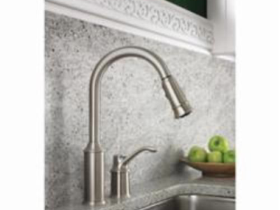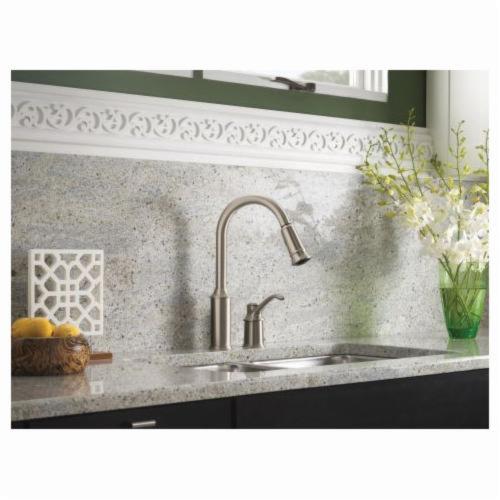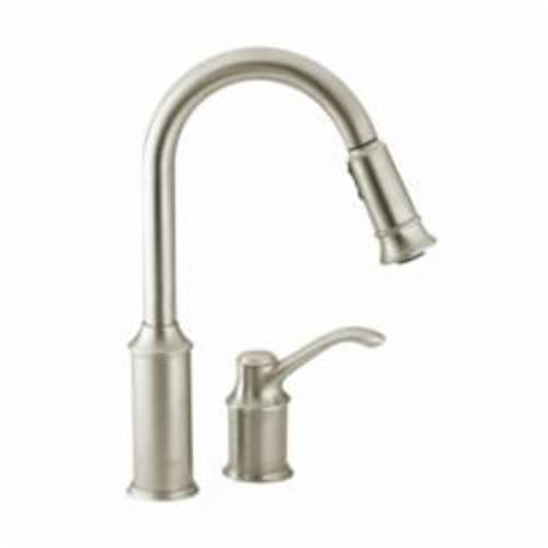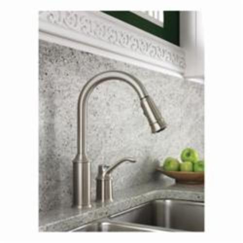 Moen® Kitchen Faucet, Aberdeen™ Collection, 1.5 gpm Flow Rate, High Arc Pull-Down Spout, 7.87 in Spout Reach, 14.63 in Spout Height, 68 in Hose, Lever Handle, 1 Handles, 2 Faucet Holes, 1-1/4 in Faucet Hole, 3/8 in Connection, Compression Connection, Spray Pattern: Aerated Stream, Function: Traditional, 3 Spray Functions, 2 in Maximum Deck Thickness, Deck Mounting, 1255 Duralast® Ceramic Disc, 8 in W x 7.88 in D x 14.63 in H, Metal, Classic Stainless Steel, Domestic