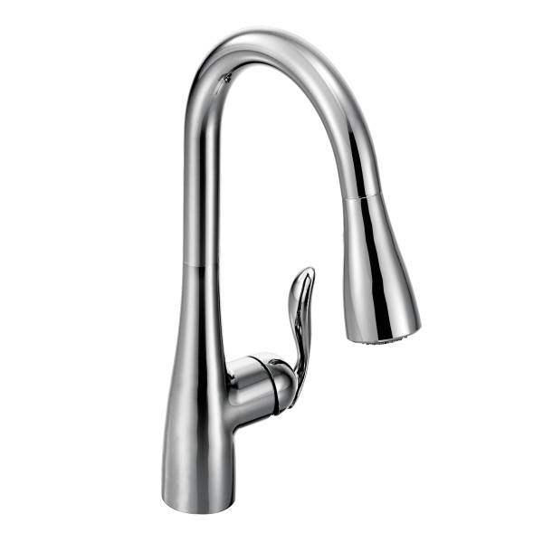 Moen® Kitchen Faucet, Arbor® Collection, 1.5 gpm Flow Rate, High Arc Pull-Out Spout, 7.87 in Spout Reach, 15-1/2 in Spout Height, 68 in Hose, Lever Handle, 1 Handles, 1/3 Faucet Holes, 1-1/2 in Faucet Hole, 3/8 in Connection, Compression Connection, Spray Pattern: Aerated Stream, Function: Traditional, 3 Spray Functions, 2-1/2 in Maximum Deck Thickness, Deck Mounting, 1255 Duralast® Ceramic Disc, 10.25 in W x 7.88 in D x 15.5 in H, Metal, Polished Chrome, Domestic