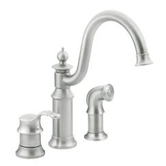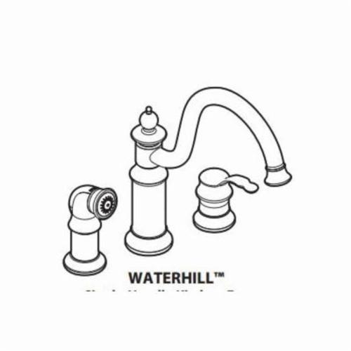 Moen® Kitchen Faucet, Waterhill™ Collection, 1.5 gpm Flow Rate, 8 in Center Distance, High-Arc Spout, 9-3/8 in Spout Reach, 8-1/2 in Spout Height, Lever Handle, 1 Handles, Side Spray(Y/N): Yes, 3 Faucet Holes, 1-1/4 in Faucet Hole, 3/8 in Connection, Compression Connection, Spray Pattern: Aerated Stream, 2-1/4 in Maximum Deck Thickness, Deck Mounting, 1255™ Duralast™, 12-1/4 in H Dimensions, Metal, Classic Stainless, Domestic