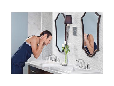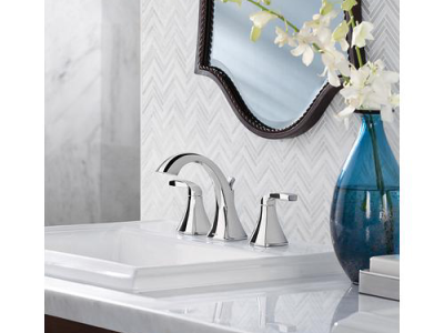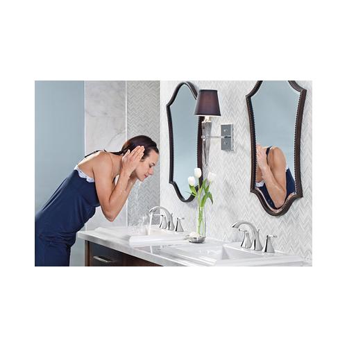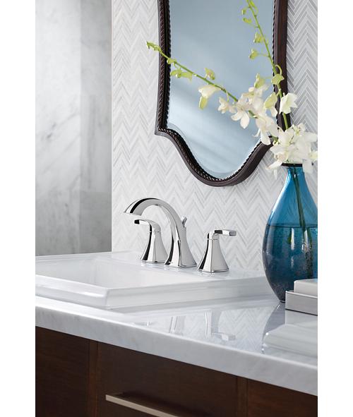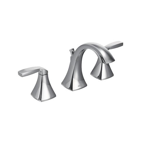 Moen®, T6905, Bathroom Faucet, Series: T6905, Voss™ Collection, 1.5 gpm Flow Rate, 8 in Center Distance, Fixed Spout, 4-3/4 in Spout Reach, 4-1/2 in Spout Height, Lever Handle, 2 Handles, Pop-Up Drain, 3 Faucet Holes, 1/2 in Connection, IPS Connection, 1-1/4 in Maximum Deck Thickness, Deck Mounting, 1224 Ceramic Disc Cartridge, 13.5 in W x 5.88 in D x 5.88 in H Dimensions, Metal, Chrome, Domestic