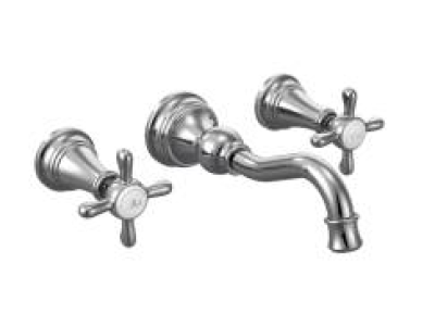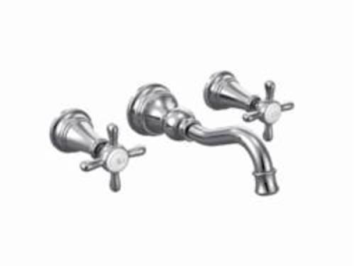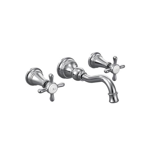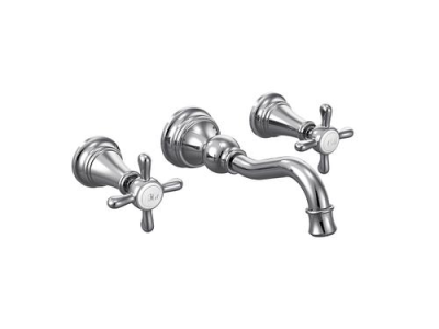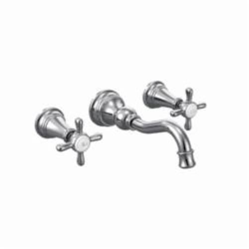 Moen®, TS42112, Bathroom Faucet, Series: TS42112, Weymouth™ Collection, 1.2 to 1.5 gpm Flow Rate, 8 in Center Distance, Fixed Spout, 7.84 in Spout Reach, 5-1/4 in Spout Height, Cross Handle, 2 Handles, Pop-Up Drain, 3 Faucet Holes, 1/2 in Connection, Function: Traditional, Wall Mounting, 1224 Ceramic Disc Cartridge, 11 in W x 3 in D x 2-1/2 in H Dimensions, Metal, Chrome, Domestic