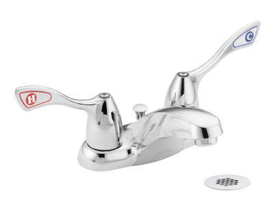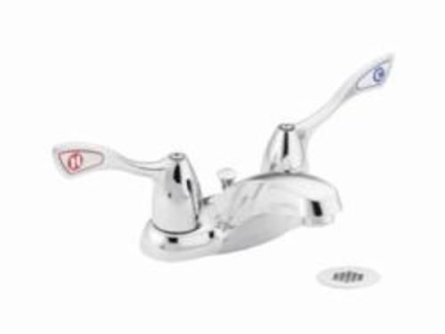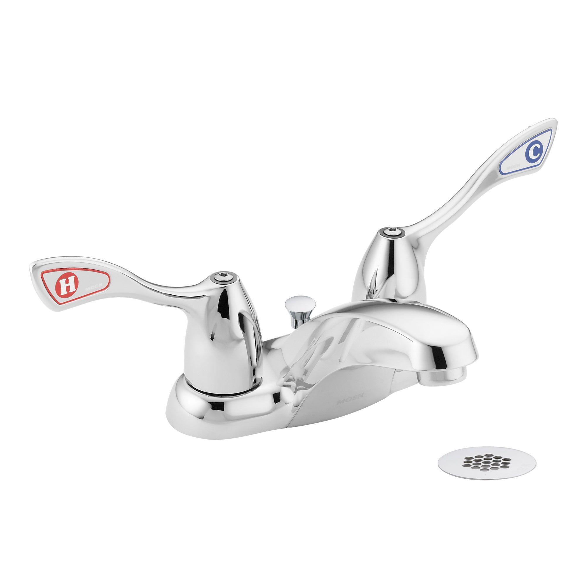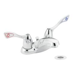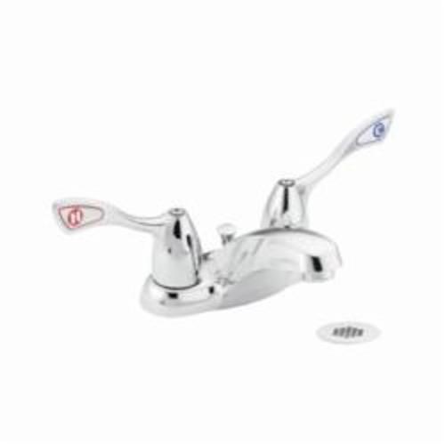 Moen® Centerset Bathroom Faucet, M-BITION™ Collection, 1.2 gpm Flow Rate, 4 in Center Distance, Fixed Spout, 6.17 in Spout Reach, 3.34 in Spout Height, Lever Handle, 2 Handles, Grid Strainer Drain, 2 Faucet Holes, 1/2 in Connection, IPS Connection, 1-3/4 in Maximum Deck Thickness, Deck Mounting, 1224 Ceramic Disc Cartridge, 12-19/32 in W x 6-11/64 in D x 3-11/32 in H Dimensions, Brass, Polished Chrome, Domestic