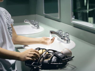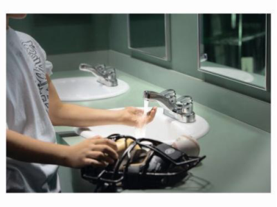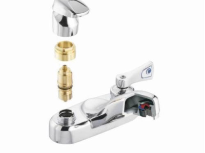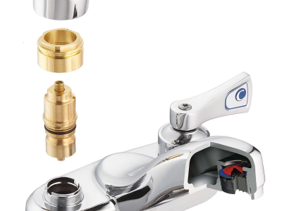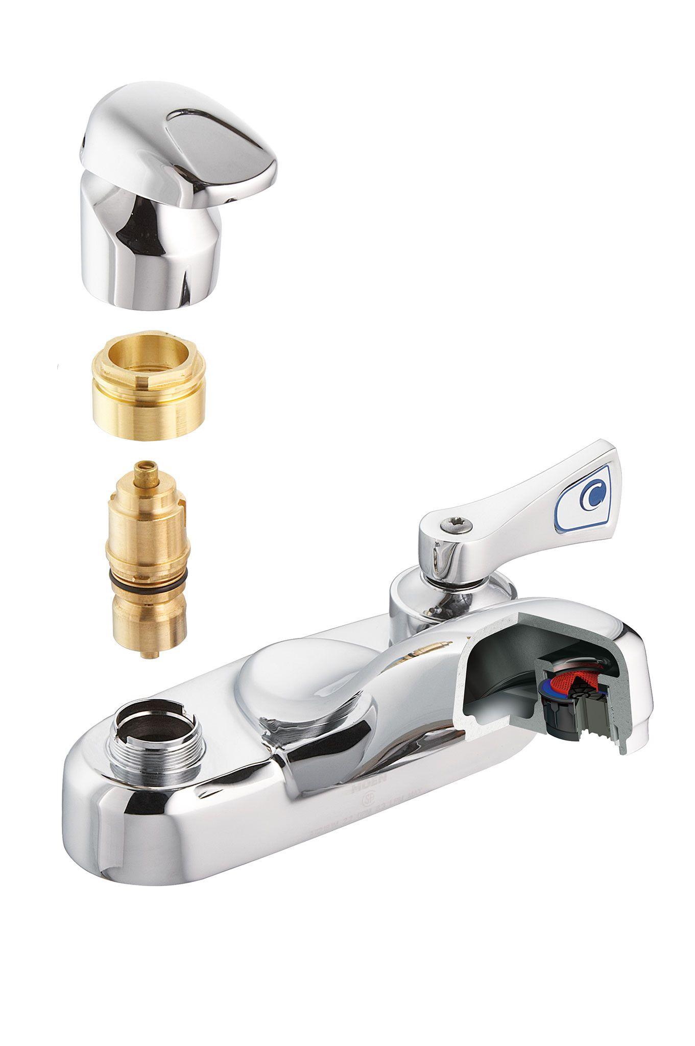 This two-handle metering faucet is constructed of brass and chrome plated and has a unique cartridge that separates water, dirt and line trash from the timing mechanism. The metering faucet is designed to deliver either tempered or ambient water. Chrome f