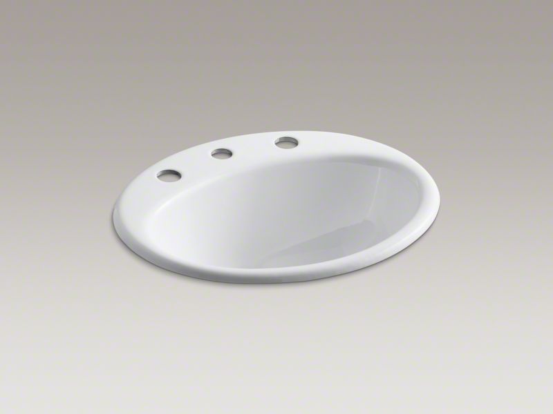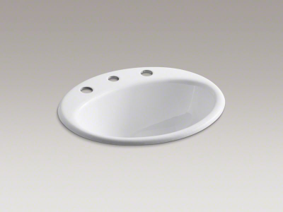 Kohler® Self-Rimming Bathroom Sink, Farmington®, Oval, 16 in L x 11 in W Bowl, 1-11/16 in Drain Opening, 3 Faucet Holes, 8 in Faucet Hole Spacing, 1 Basin, 19-1/4 in W x 16-1/4 in D x 8-3/4 in H, Drop-In Mount, Enameled Cast Iron, White, ADA Compliance (Yes/No): Yes