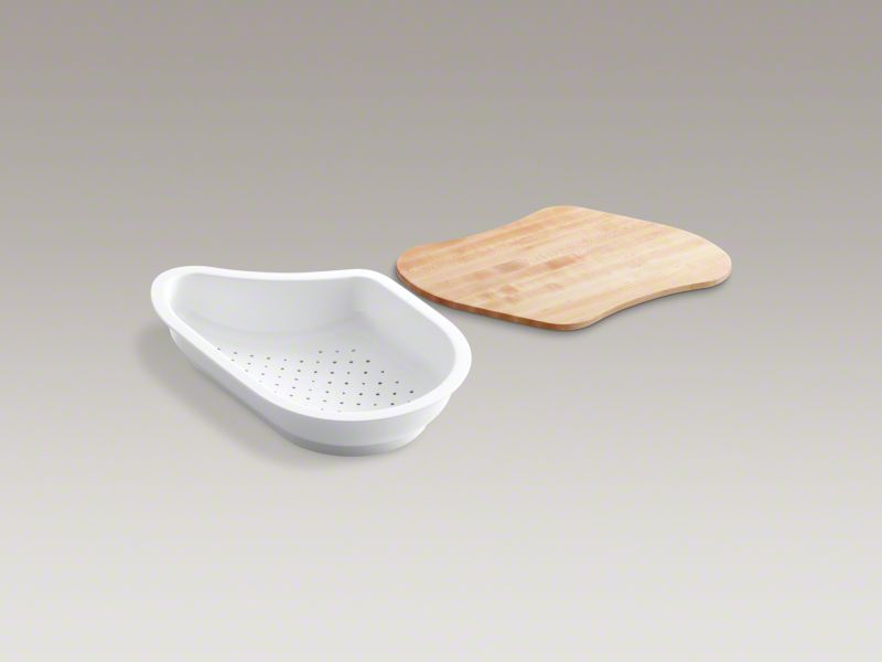 Expand the functionality of your kitchen with a custom cutting board and colander, designed to fit snugly into select Ravinia(TM) and Undertone(R) kitchen sinks. The cutting board is constructed of premium hardwood for long-lasting performance, and sits atop a white polypropylene colander that can be used for draining and rinsing.