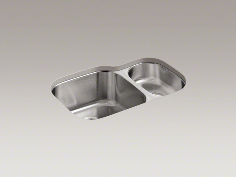 Kohler® 3355-NA Undertone® Kitchen Sink, Rectangular Shape, 9 in Left, 18 in Right L x 15 in Left, 18 in Right W Bowl x 5-1/2 in Left, 9-1/2 in Right D Bowl, 30-3/4 in L x 20-1/8 in W x 9-5/8 in H, Undermount Mounting, Stainless Steel
