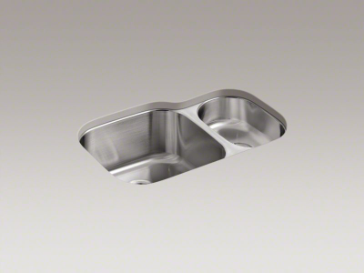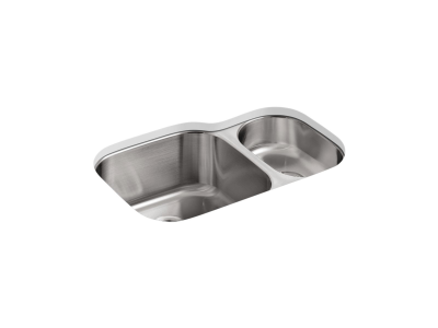 Kohler®, 3355-NA, Kitchen Sink, Undertone® Collection, Rectangular Shape, 9 in Left, 18 in Right Bowl Length, 15 in Left, 18 in Right Bowl Width, 5-1/2 in Left, 9-1/2 in Right Bowl Depth, 3-5/8 in Drain Opening, 2 Bowls, 30-3/4 in L x 20-1/8 in W x 9-5/8 in H Overall, Undermount Mounting, Stainless Steel