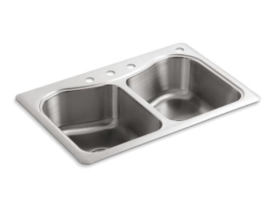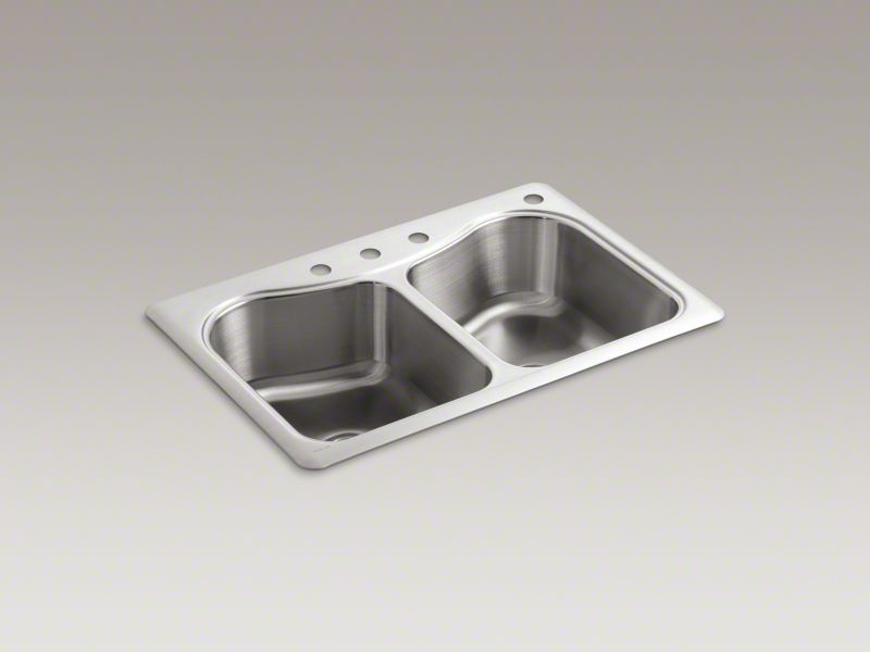 Kohler®, 3369-4-NA, Kitchen Sink, Staccato™ Collection, Rectangular Shape, 17-1/16 in Left, 17-1/16 in Right Bowl Length, 13-15/16 in Left, 13-15/16 in Right Bowl Width, 8 in Bowl Depth, 3-5/8 in Drain Opening, 4 Faucet Holes, 4 in Faucet Hole Spacing, 2 Bowls, 33 in L x 22 in W x 8-5/16 in H Overall, Top Mounting, Stainless Steel