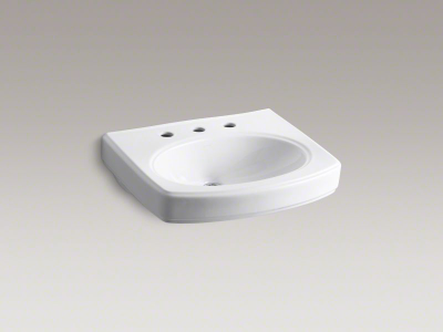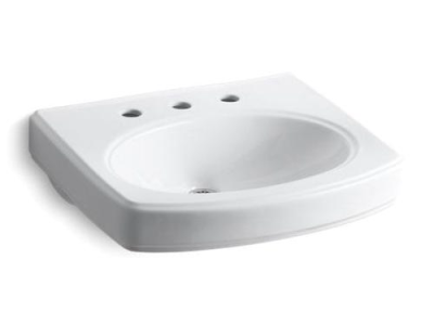 Kohler®, 2028-8-0, Bathroom Sink With Overflow Drain, Pinoir® Collection, Oval Shape, 18 in L x 12 in W Bowl, 1-3/4 in Drain Opening, 3 Faucet Holes, 8 in Faucet Hole Spacing, 1 Basins, 22 in W x 18 in D Overall, Wall Mounting, Vitreous China, White, ADA Compliance: Yes