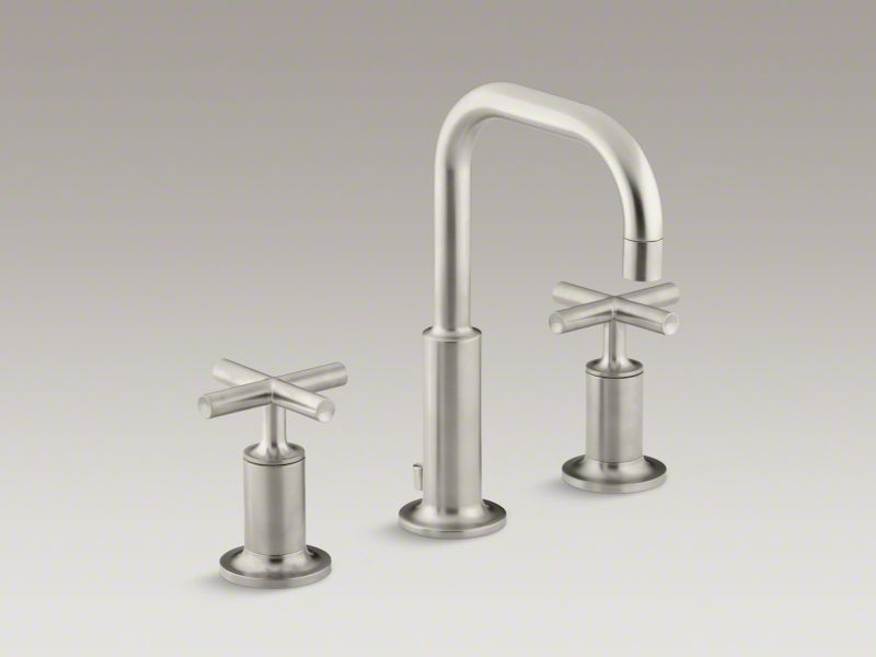 Combining architectural forms with sensual design lines, KOHLER® Purist faucets and accessories bring a touch of modern elegance to your bathroom. This widespread bathroom sink faucet exemplifies the Purist collection's understated style, with its low gooseneck spout and cross handles. Easy-to-install and leak-free UltraGlide® valves provide reliable performance and durability. The spout features laminar flow, which helps conserve water while preventing splashing.