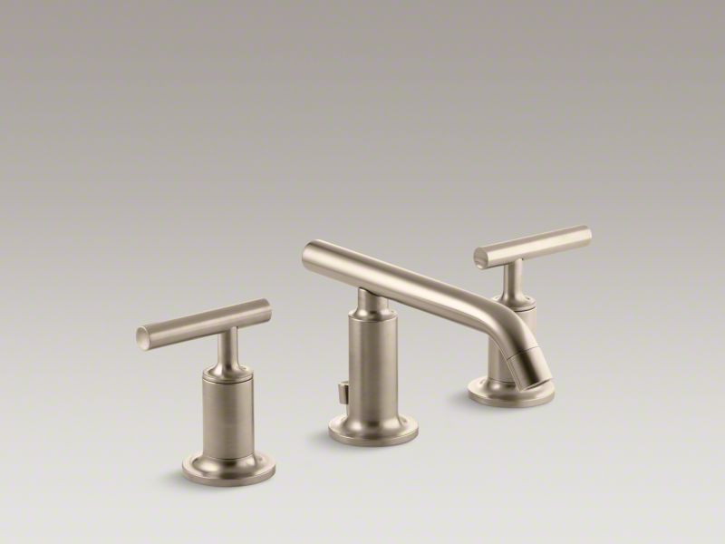 Kohler® Widespread Bathroom Sink Faucet, Purist®, 1.2 gpm, 8 to 16 in Center Distance, Low-Arc Spout, 5 in Spout Reach, 2-3/8 in Spout Height, Low Lever, 2 Handles, Pop-Up Drain, 3 Faucet Holes, 1/2-14, NPSM, 3/8 in With Dished Washer/1-5/8 in Without Dished Washer Maximum Deck Thickness, Deck Mount, Ceramic Disc Valve/Cartridge, 5 in L x 8 in W x 3-15/16 in H, Solid Brass, Vibrant® Brushed Bronze