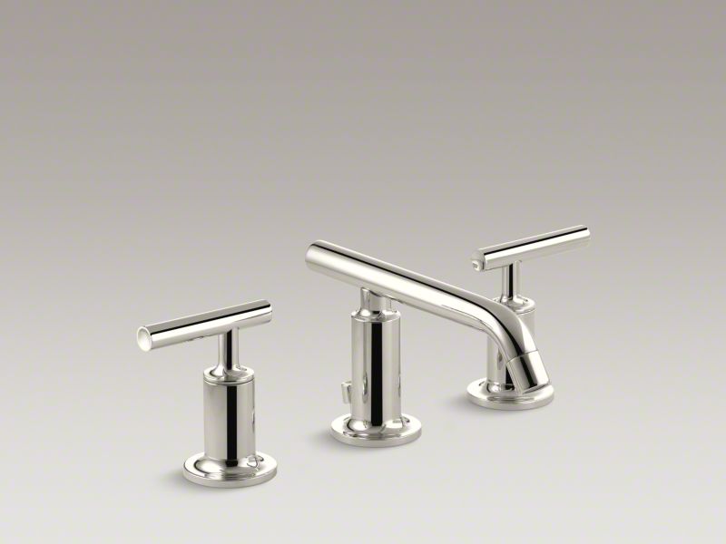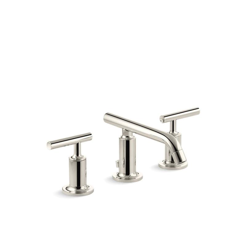 Kohler® Widespread Bathroom Sink Faucet, Purist®, 1.2 gpm, 8 to 16 in Center Distance, Low-Arc Spout, 5 in Spout Reach, 2-3/8 in Spout Height, Low Lever, 2 Handles, Pop-Up Drain, 3 Faucet Holes, 1/2-14, NPSM, 3/8 in With Dished Washer/1-5/8 in Without Dished Washer Maximum Deck Thickness, Deck Mount, Ceramic Disc Valve/Cartridge, 5 in L x 8 in W x 3-15/16 in H, Solid Brass, Vibrant® Polished Nickel