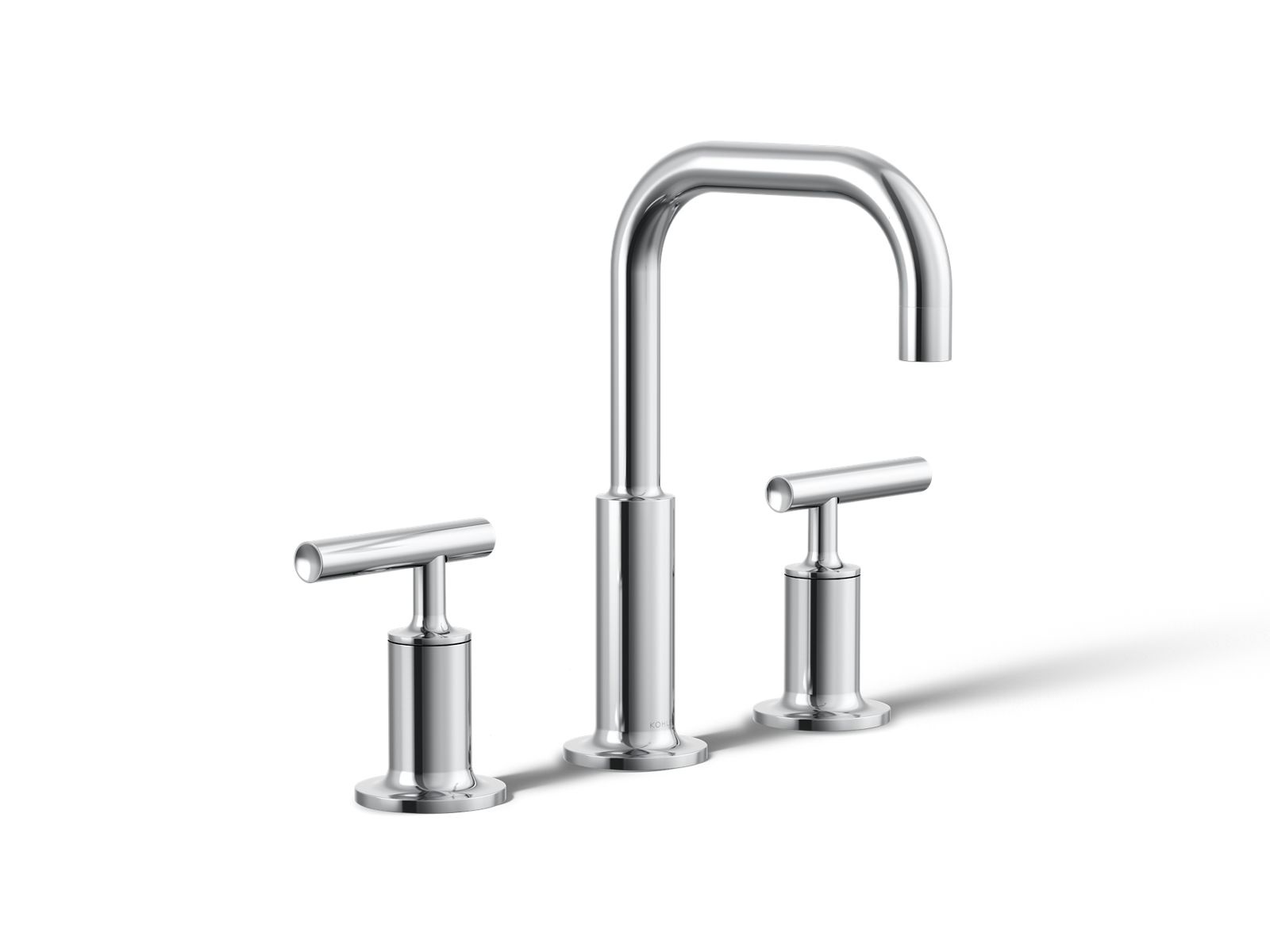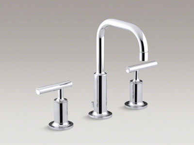 Combining architectural forms with sensual design lines, KOHLER® Purist faucets and accessories bring a touch of modern elegance to your bathroom. This widespread bathroom sink faucet exemplifies the Purist collection's understated style, with its low gooseneck spout and cross handles. Easy-to-install and leak-free UltraGlide® valves provide reliable performance and durability. The spout features laminar flow, which helps conserve water while preventing splashing.