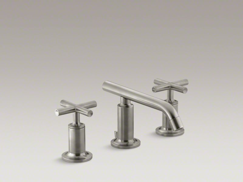 Kohler® Widespread Bathroom Sink Faucet, Purist®, 1.2 gpm, 8 to 16 in Center Distance, Low-Arc Spout, 5 in Spout Reach, 2-3/8 in Spout Height, Low Cross, 2 Handles, Pop-Up Drain, 3 Faucet Holes, 1/2-14, NPSM, 3/8 in With Dished Washer/1-5/8 in Without Dished Washer Maximum Deck Thickness, Deck Mount, Ceramic Disc Valve/Cartridge, 5 in L x 8 in W x 3-15/16 in H, Solid Brass, Vibrant® Brushed Nickel