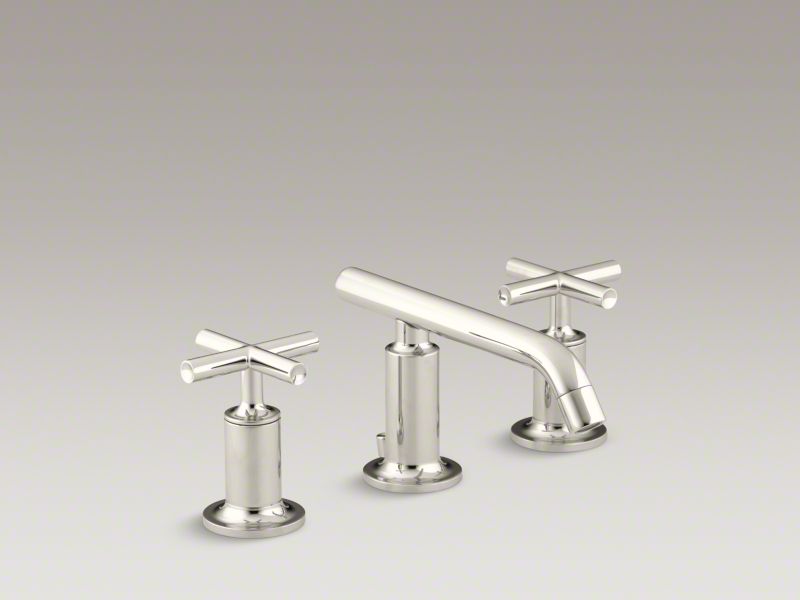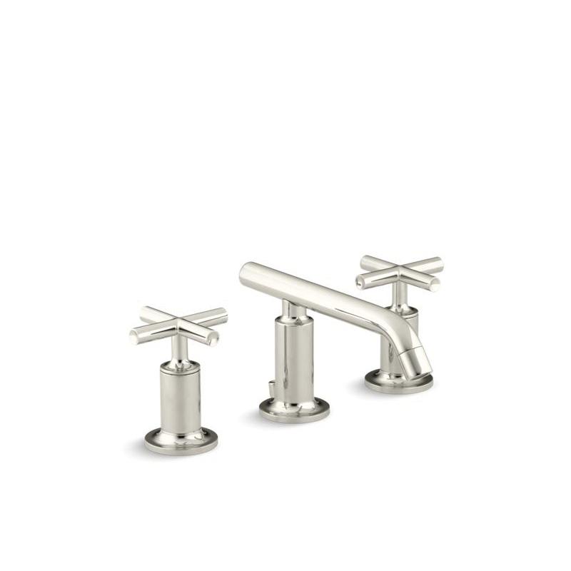 Kohler® Widespread Bathroom Sink Faucet, Purist®, 1.2 gpm, 8 to 16 in Center Distance, Low-Arc Spout, 5 in Spout Reach, 2-3/8 in Spout Height, Low Cross, 2 Handles, Pop-Up Drain, 3 Faucet Holes, 1/2-14, NPSM, 3/8 in With Dished Washer/1-5/8 in Without Dished Washer Maximum Deck Thickness, Deck Mount, Ceramic Disc Valve/Cartridge, 5 in L x 8 in W x 3-15/16 in H, Solid Brass, Vibrant® Polished Nickel