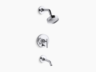 Purist® faucets and accessories combine simple, architectural forms with sensual design lines. Featuring this modern, minimalist style, the Purist® bath and shower valve trim creates a sophisticated, unified look in your shower with a lever handle, spout and showerhead. Pair this trim with a Rite-Temp® pressure-balancing valve with push-button diverter, which maintains your desired water temperature during pressure fluctuations.
