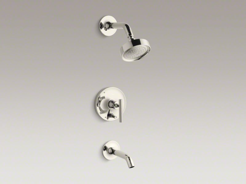 Purist® faucets and accessories combine simple, architectural forms with sensual design lines. Featuring this modern, minimalist style, the Purist® bath and shower valve trim creates a sophisticated, unified look in your shower with a lever handle, spout and showerhead. Pair this trim with a Rite-Temp® pressure-balancing valve with push-button diverter, which maintains your desired water temperature during pressure fluctuations.