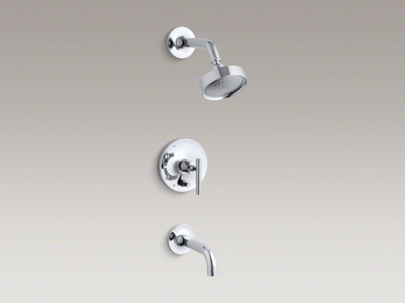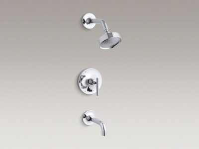 Purist faucets and accessories combine simple, architectural forms with sensual design lines. Featuring this modern, minimalist style, the Purist bath and shower faucet trim creates a sophisticated, unified look in your shower with a lever handle, spout, and showerhead. Pair this trim with a Rite-Temp® pressure-balancing valve with push-button diverter, which maintains your desired water temperature during pressure fluctuations.