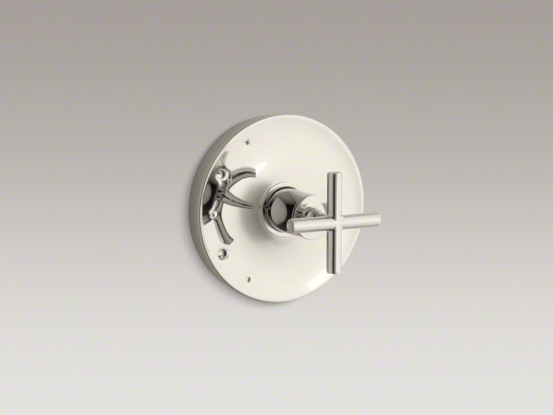 Purist faucets and accessories combine simple, architectural forms with sensual design lines. Featuring this modern, minimalist style, this Purist valve trim brings sophistication to your shower with its bold shape and single cross handle. Pair this trim with a Rite-Temp(R) pressure-balancing valve, which maintains your desired water temperature during pressure fluctuations.