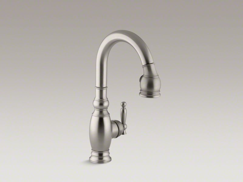 The traditional design and user-friendly features of this Vinnata bar sink faucet make it an attractive, hard-working addition to the kitchen or entertainment area. When paired with a secondary sink, this faucet aids in food preparation and cleanup. An elegant gooseneck swing spout reaches over large items, while a pull-down sprayhead operates with the push of a button, allowing you to switch between a gentle, aerated stream and a powerful spray. The easy-to-clean sprayface resists mineral buildup.