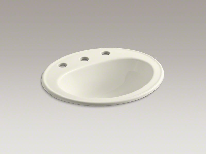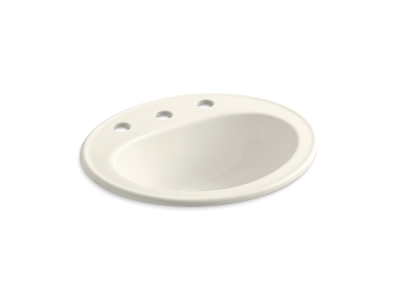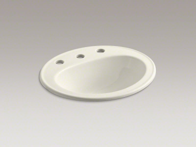 Kohler® Self-Rimming Bathroom Sink, Pennington®, Oval, 16 in L x 11 in W Bowl, 1-3/4 in Drain Opening, 3 Faucet Holes, 8 in Faucet Hole Spacing, 1 Basin, 20-1/4 in W x 17-1/2 in D x 8-1/2 in H, Drop-In Mount, Vitreous China, Biscuit, ADA Compliance (Yes/No): Yes