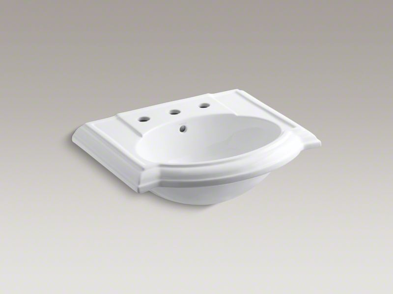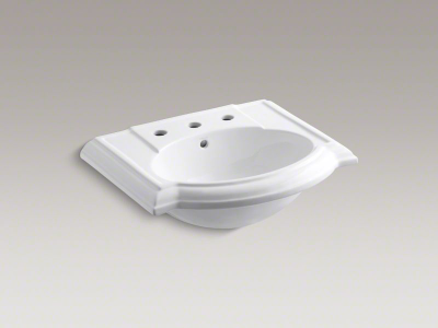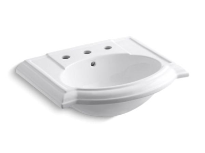 Kohler® Bathroom Sink Basin, Devonshire®, Oval, 17 in L x 12 in W Bowl, 1-3/4 in Drain Opening, 3 Faucet Holes, 4 in Faucet Hole Spacing, 1 Basin, 24-1/8 in W x 19-3/4 in D x 9 in H, Wall Mount, Vitreous China, White