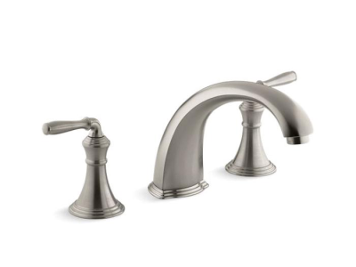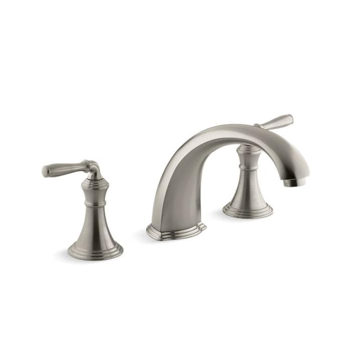 Kohler® Bath Tub Faucet Trim, Devonshire®, 16 gpm, 8 in Center Distance, Non-Diverter Spout, 9 in Spout Reach, 4-9/16 in Spout Height, Lever, 2 Handles, 3 Faucet Holes, Function: Traditional, Hand Shower Yes/No: No, 2-1/8 in Maximum Deck Thickness, Deck Mount, 9 in L x 8 in W x 6-13/16 in H, Brass, Vibrant® Brushed Nickel