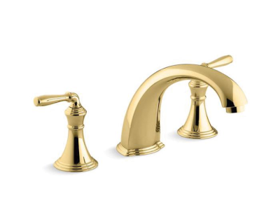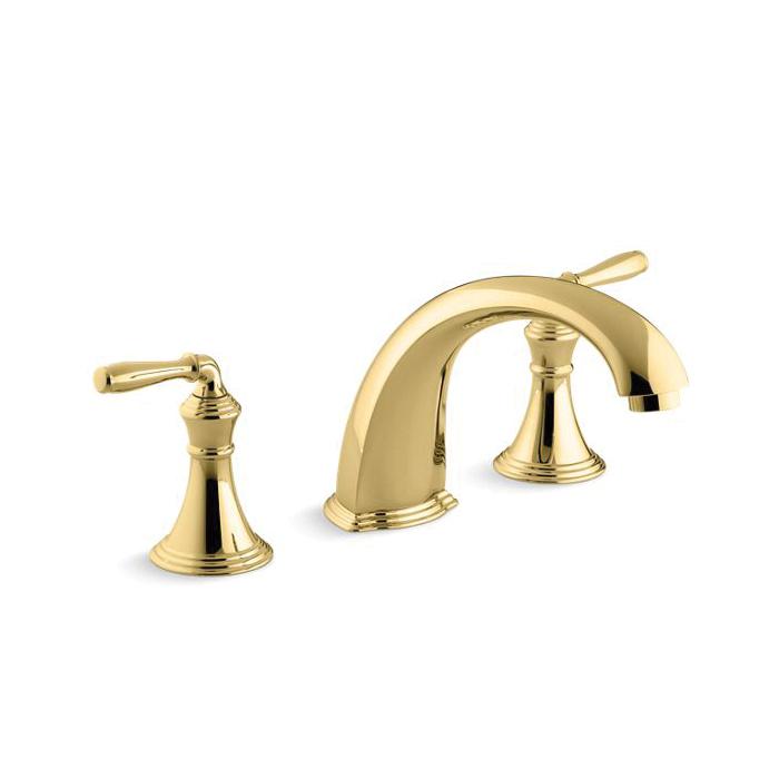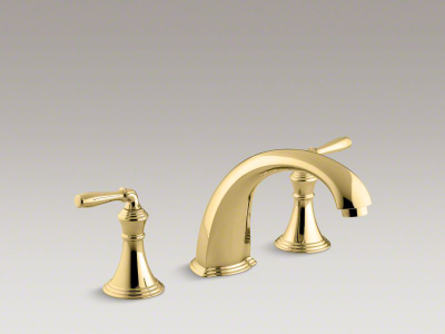 Kohler® Bath Tub Faucet Trim, Devonshire®, 16 gpm, 8 in Center Distance, Non-Diverter Spout, 9 in Spout Reach, 4-9/16 in Spout Height, Lever, 2 Handles, 3 Faucet Holes, Function: Traditional, Hand Shower Yes/No: No, 2-1/8 in Maximum Deck Thickness, Deck Mount, 9 in L x 8 in W x 6-13/16 in H, Brass, Vibrant® Polished Brass