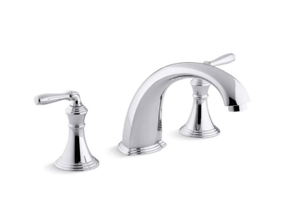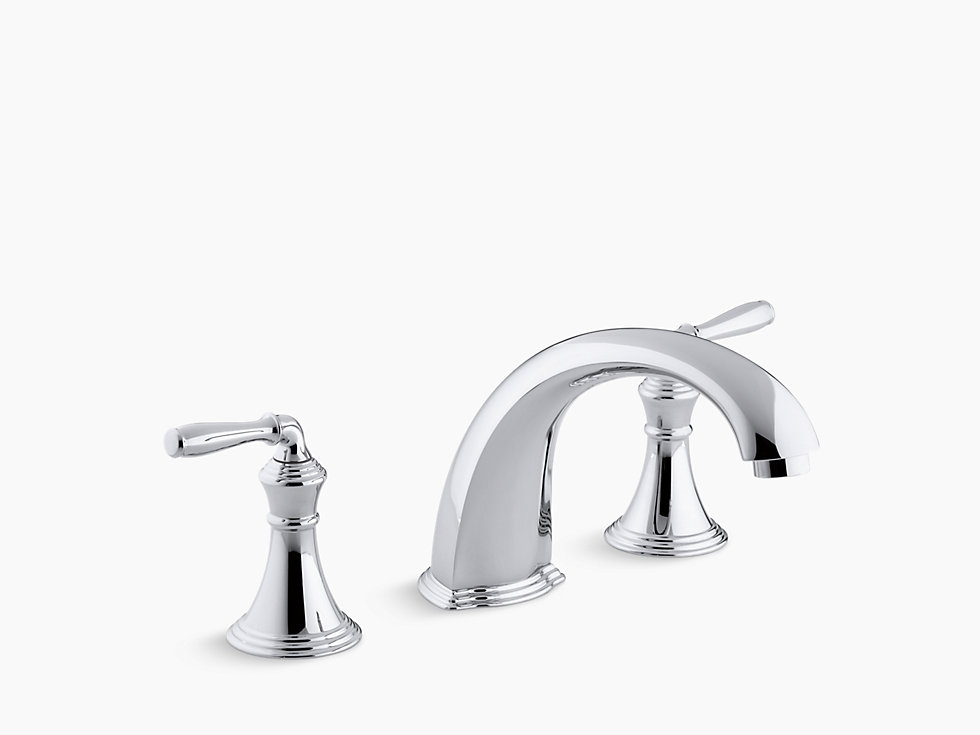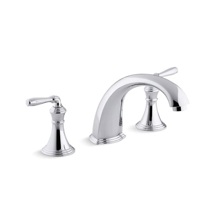 Kohler® Bath Tub Faucet Trim, Devonshire®, 16 gpm, 8 in Center Distance, Non-Diverter Spout, 9 in Spout Reach, 4-9/16 in Spout Height, Lever, 2 Handles, 3 Faucet Holes, Function: Traditional, Hand Shower Yes/No: No, 2-1/8 in Maximum Deck Thickness, Deck Mount, 9 in L x 8 in W x 6-13/16 in H, Brass, Polished Chrome