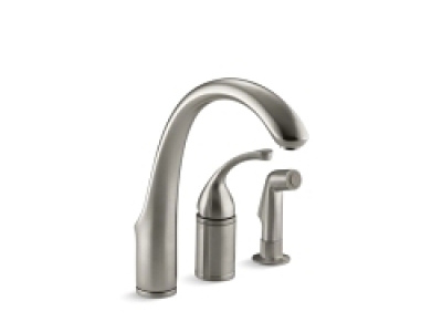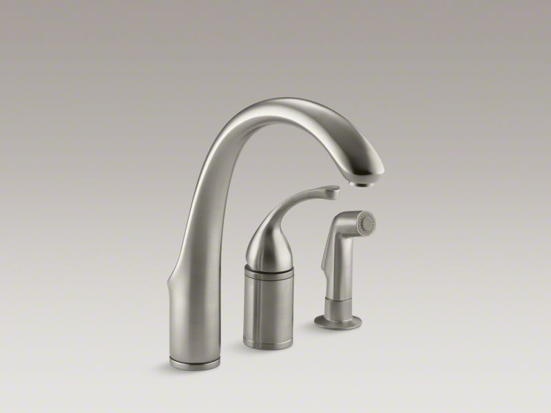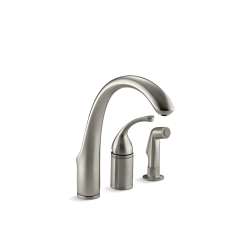 Kohler® Kitchen Sink Faucet, Remote Valve, Forte® Collection, 1.8 gpm Flow Rate, 4 to 8 in Center Distance, High-Arc Swivel Spout, 9 in Spout Reach, 9-1/16 in Spout Height, Lever Handle, 1 Handles, Side Spray(Y/N): Yes, 3 Faucet Holes, 3/8 in Connection, Compression Connection, Deck Mounting, Ceramic Disc, 11-5/8 in H, Metal, Vibrant® Brushed Nickel