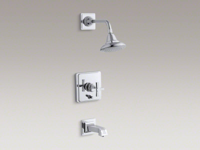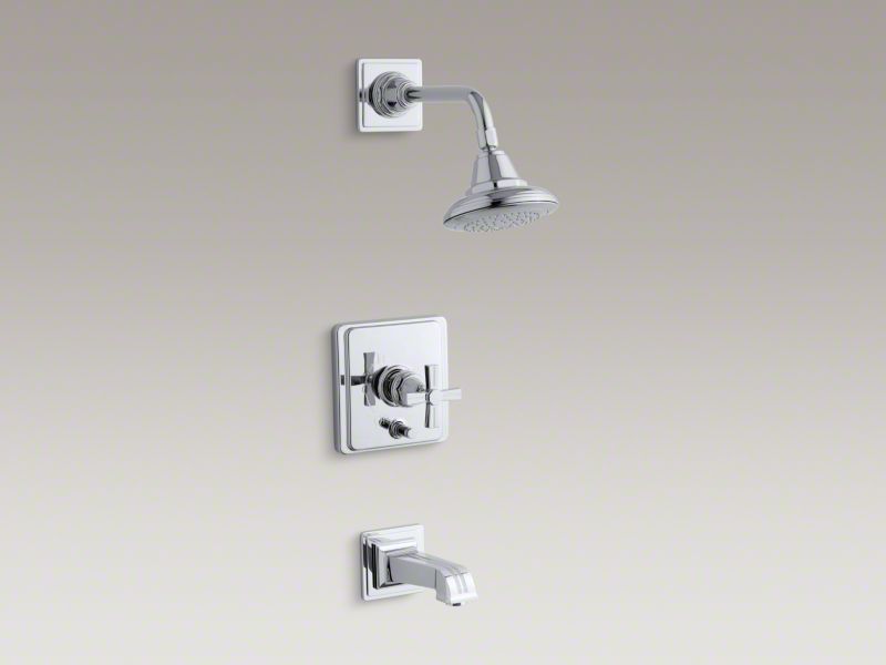 True to the classic, elegant style of 1930s Art Deco, Pinstripe faucets embody relaxed luxury with etched symmetrical lines. This bath and shower faucet trim features a cross handle, and soft, clean edges that create a strong style statement in traditional to contemporary bathrooms. Pair this trim with a Rite-Temp(R) pressure-balancing valve with push-button diverter, which maintains your desired water temperature during pressure fluctuations.