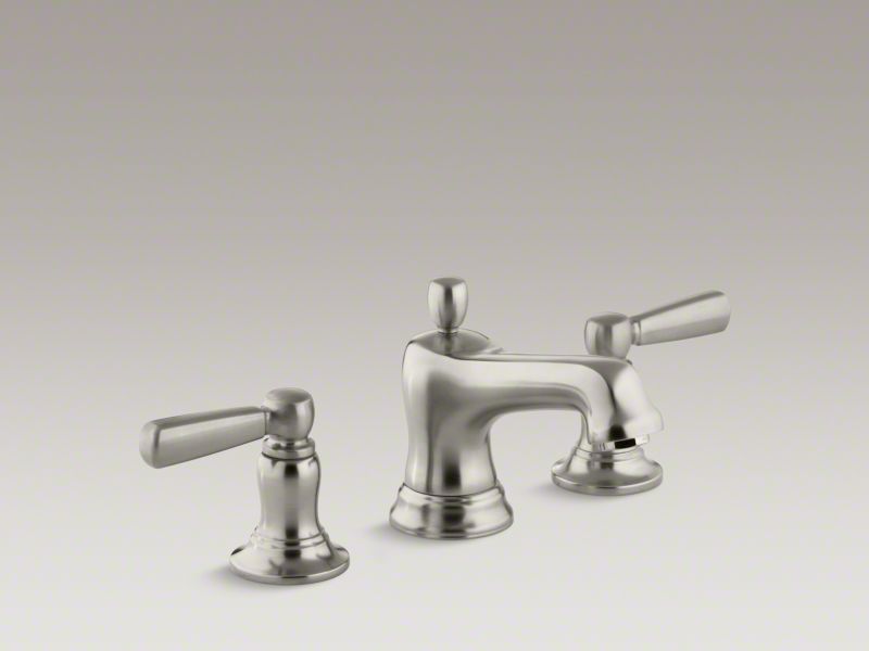 Kohler® Widespread Bathroom Sink Faucet, Bancroft®, 1.2 gpm, 8 to 16 in Center Distance, Curved Spout, 4-7/8 in Spout Reach, 2-9/16 in Spout Height, Lever Handle, 2 Handles, Pop-Up Drain, 3 Faucet Holes, 1-3/8 in Maximum Deck Thickness, Deck Mounting, Ceramic Disc, 4-7/8 in H, Solid Brass, Vibrant® Brushed Nickel