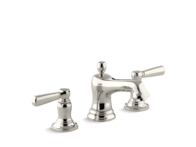 Kohler® Widespread Bathroom Sink Faucet, Bancroft®, 1.2 gpm, 8 to 16 in Center Distance, Curved Spout, 4-7/8 in Spout Reach, 2-9/16 in Spout Height, Lever Handle, 2 Handles, Pop-Up Drain, 3 Faucet Holes, 1-3/8 in Maximum Deck Thickness, Deck Mounting, Ceramic Disc, 4-7/8 in H, Solid Brass, Vibrant Polished Nickel