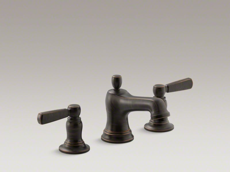 Kohler® Widespread Bathroom Sink Faucet, Bancroft®, 1.2 gpm, 8 to 16 in Center Distance, Curved Spout, 4-7/8 in Spout Reach, 2-9/16 in Spout Height, Lever Handle, 2 Handles, Pop-Up Drain, 3 Faucet Holes, 1-3/8 in Maximum Deck Thickness, Deck Mounting, Ceramic Disc, 4-7/8 in H, Solid Brass, Oil Rubbed Bronze