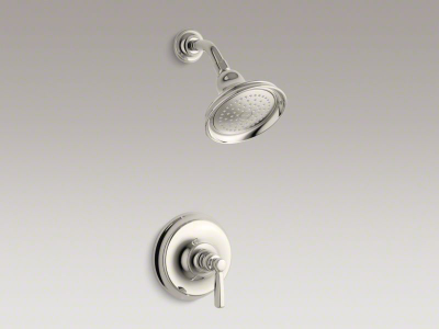 Reminiscent of the traditional elegance of early 1900s American design, the Bancroft(R) collection embodies a nostalgic aesthetic that achieves universal appeal for today's bathroom. This Bancroft shower faucet trim with showerhead and metal lever handle features a Rite-Temp(TM) pressure-balancing valve that maintains a consistent water temperature within 3 degrees Fahrenheit. Its classic lines and solid brass construction provide enduring beauty for a complete, coordinated look.
