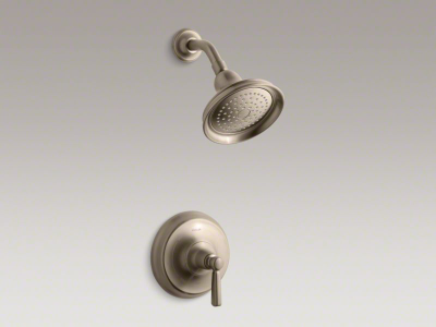 Reminiscent of the traditional elegance of early 1900s American design, the Bancroft(R) collection embodies a nostalgic aesthetic that achieves universal appeal for today's bathroom. This Bancroft shower faucet trim with showerhead and metal lever handle features a Rite-Temp(TM) pressure-balancing valve that maintains a consistent water temperature within 3 degrees Fahrenheit. Its classic lines and solid brass construction provide enduring beauty for a complete, coordinated look.