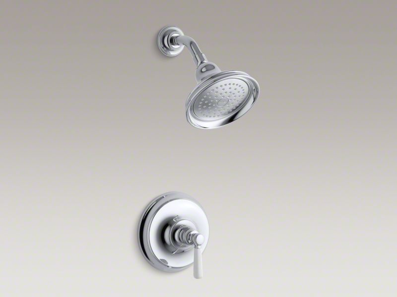 Reminiscent of the traditional elegance of early 1900s American design, the Bancroft(R) collection embodies a nostalgic aesthetic that achieves universal appeal for today's bathroom. This Bancroft shower faucet trim with showerhead and White ceramic lever handle features a Rite-Temp(TM) pressure-balancing valve that maintains a consistent water temperature within 3 degrees Fahrenheit. Its classic lines and solid brass construction provide enduring beauty for a complete, coordinated look.