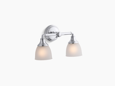 Kohler®, 10571-CPL, Bathroom Sconce, Dimmable, Series: 10571, Devonshire® Collection, 120 V AC, 100 W Lamp, E26 Medium Lamp Base, 2 Lamps, Frosted Glass Shade, Wall Mounting, Metal Housing Material, Polished Chrome Housing Finish, 15 in L x 6 in W x 9-1/8 in H Dimensions