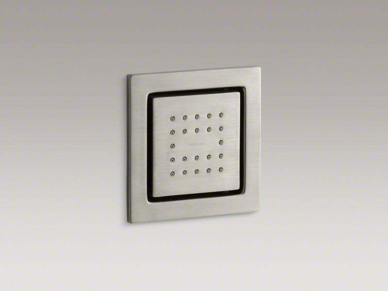 KOHLER® WaterTile body sprays lie virtually flush to the wall and can be placed almost anywhere. This square wall-mount 22-nozzle configuration delivers a high-volume, invigorating spray for a rejuvenating hydrotherapy experience.