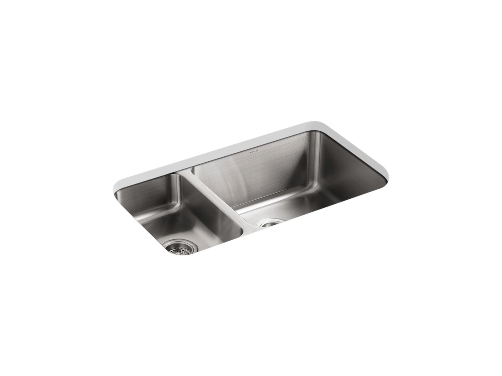 Kohler® 3174-L-NA Undertone® Kitchen Sink, Rectangular Shape, 9 in Left, 19 in Right L x 15-3/4 in Left, 15-3/4 in Right W Bowl x 5-1/2 in Left, 9-1/2 in Right D Bowl, 31-1/2 in L x 18 in W x 9-13/16 in H, Undermount Mounting, Stainless Steel