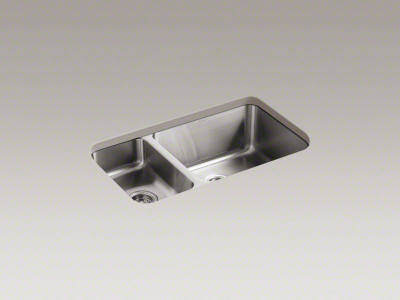Constructed from premium stainless steel, KOHLER® Undertone brings home the durability, quiet performance, and polished look of professional kitchens. This undermount kitchen sink features an engineered sound-absorption system that significantly reduces disposal and dishwashing noise, as well as condensation underneath the sink in high-humidity environments. The sink's rectangular high/low design features a smaller disposal bowl for easier food prep and cleaning, and a larger, deeper main bowl with plenty of room for bulky items. A mirror-finish edge adds an elegant accent.