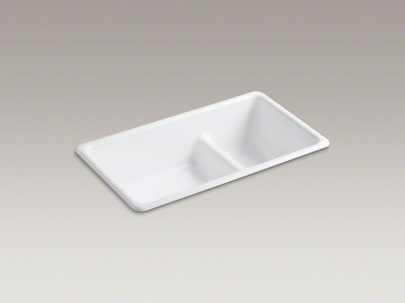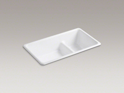 Kohler® 6625-0 Kitchen Sink, White, Rectangular Shape, 9-1/4 in Left, 19-1/4 in Right L x 16 in Left, 16 in Right W Bowl x 9 in Left, 9 in Right D Bowl, 33 in L x 18-3/4 in W x 9-5/8 in H, Top Mounting, Enameled Cast Iron