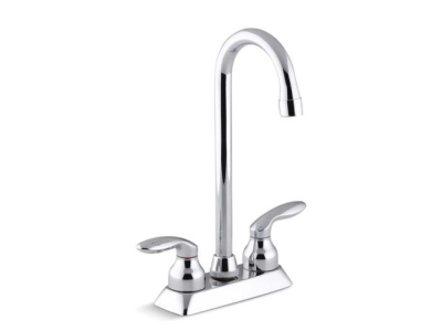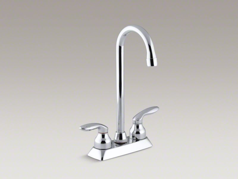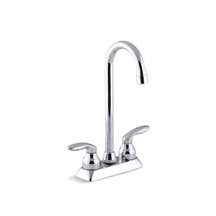 Kohler® Centerset Bar Sink Faucet, Basic, Coralais®, 1.5 gpm, 4 in Center Distance, High-Arc Gooseneck Spout, 4 in Spout Reach, 11-3/16 in Spout Height, Lever, 2 Handles, 2 Faucet Holes, 1/2-14, NPSM, 1.13 in Maximum Deck Thickness, Deck Mount, Ceramic Disc Valve/Cartridge, 4 in L x 4 in W x 11-3/16 in H, Metal, Polished Chrome