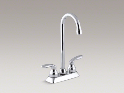This Coralais sink faucet adds classic style to your entertainment station or bar setup. It features two sculptured lever handles and a stationary, high-arch gooseneck spout that allows plenty of room for preparing drinks and appetizers, chilling bottles and handling party cleanup.