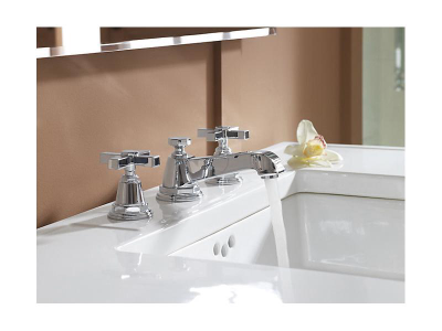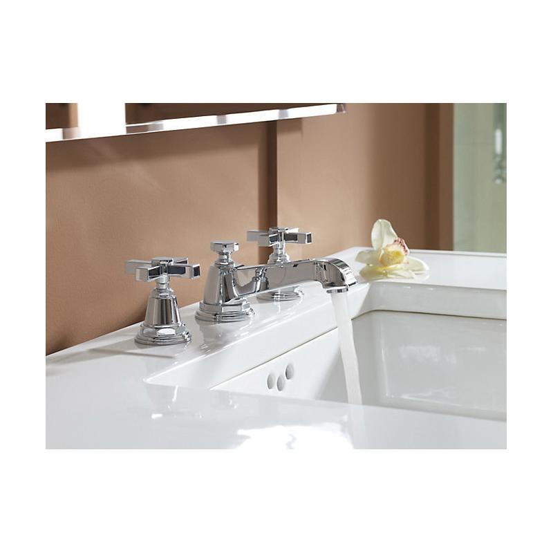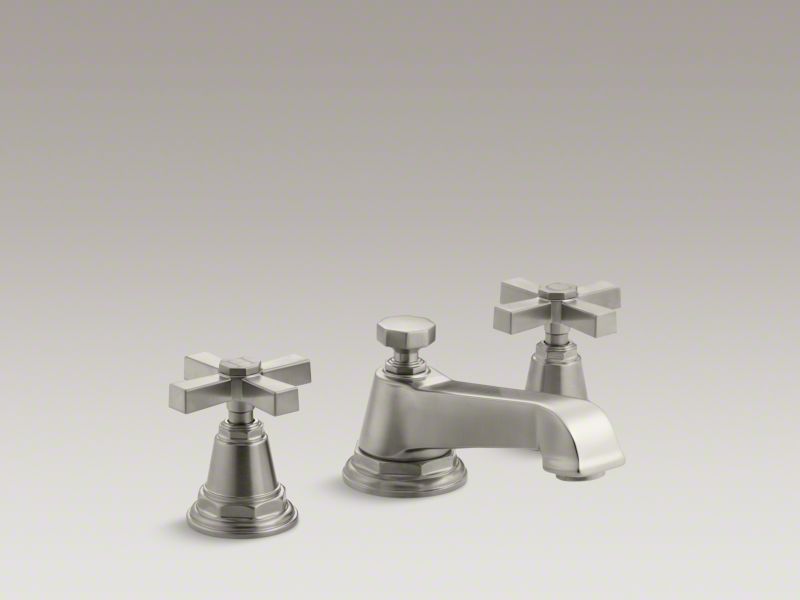 Featuring elements of vintage 1930s American design, the KOHLER® Pinstripe Pure bathroom sink faucet lends a sense of relaxed luxury to your bath or powder room. The classic cross handles and angular widespread bathroom sink faucet spout bring a seamless balance of geometric forms and symmetrical lines. This faucet is outfitted with easy-to-install, leak-free UltraGlide® valves for excellent performance.