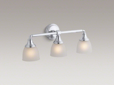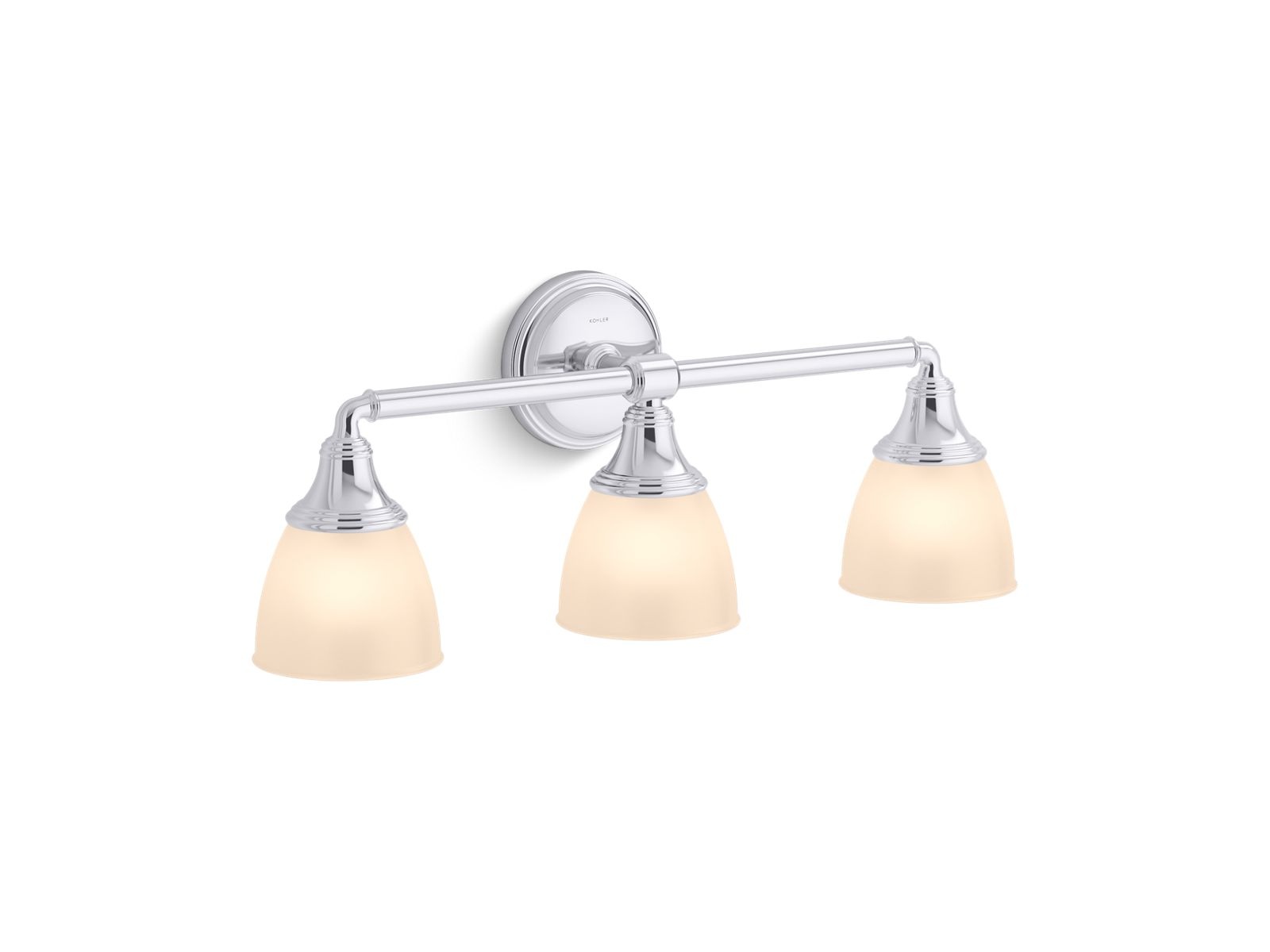 Kohler®, 10572-CPL, Bathroom Sconce, Dimmable, Series: 10572, Devonshire® Collection, 120 V AC, 100 W Lamp, E26 Medium Lamp Base, 3 Lamps, Frosted Glass Shade, Wall Mounting, Metal Housing Material, Polished Chrome Housing Finish, 23-1/16 in L x 6 in W x 9-1/8 in H Dimensions